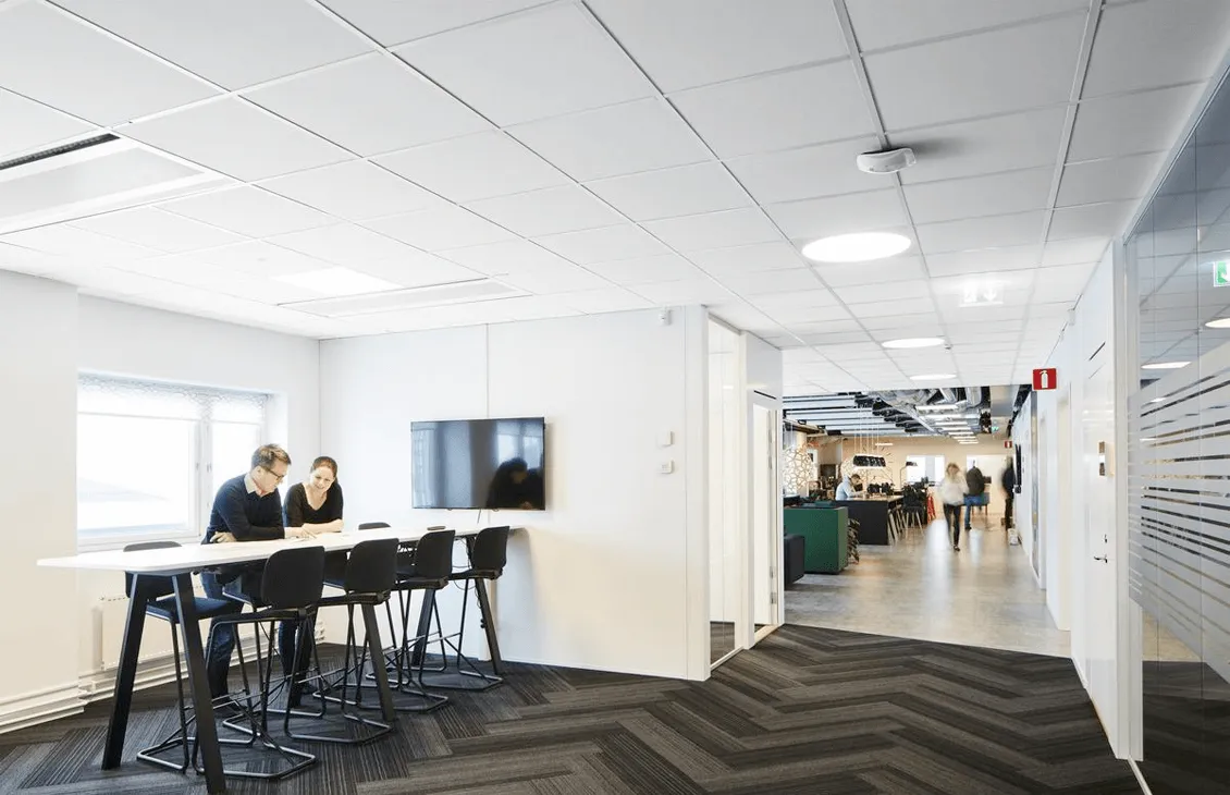 Потолочная система Ecophon Фокус A состоит из открытой подвесной системы и легко демонтируемых панелей. Она предназначена для помещений, в которых необходим прочный подвесной потолок.